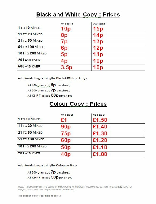 * The prices quoted above are for the first 10 copies which, in the case of Black & White, accounts mainly for the time involved in the process.